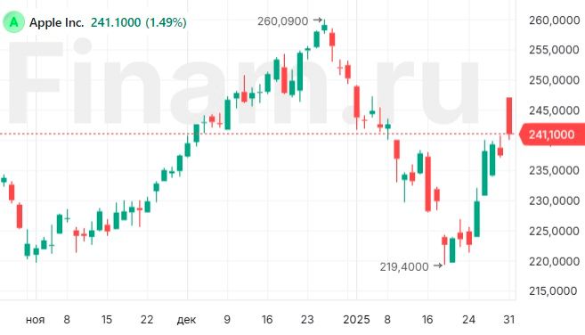 Выручка Apple в I квартале 2025 фингода с окончанием 28 декабря увеличилась на 4% г/г, до рекордных $124,3 млрд, и немного превысила консенсус-прогноз на уровне $124,1 млрд. Выручка от реализации iPhone уменьшилась на 0,8%, до $69,1 млрд, в то время как ожидался подъем до $70,7 млрд. Поступления от сервисов подскочили на 13,9%, до $26,3 млрд. Географически Apple зафиксировала увеличение выручки практически во всех регионах, кроме Большого Китая (материковый Китай, Гонконг, Макао и Тайвань), где продажи упали на 11,1%, до $18,5 млрд. Это обусловлено дальнейшим ростом конкуренции со стороны местных производителей электроники, а также недоступностью ИИ-технологии Apple Intelligence для китайских пользователей. Показатель EBITDA Apple в I финквартале увеличился на 6,2% г/г, до $45,9 млрд, при этом рентабельность по EBITDA улучшилась на 0,8 п. п., до 36,9%. Показатель EPS поднялся на 10,1%, до рекордных $2,40, и на 5 центов превзошел среднюю оценку аналитиков Уолл-стрит. Отметим, что, благодаря низкой долговой нагрузке и способности генерировать высокие денежные потоки, Apple продолжает направлять огромные средства на выплаты акционерам. Так, в отчетном периоде компания потратила более $30 млрд на выкуп акций и выплату дивидендов.