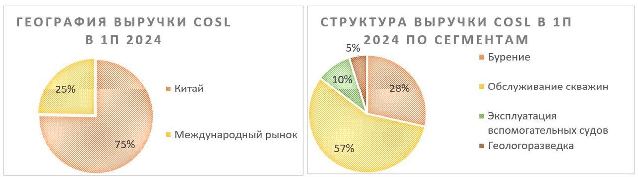 China Oilfield Services Limited (COSL) — китайская нефтесервисная компания, которая специализируется на шельфовой добыче нефти. Ключевым рынком для компании является, конечно, Китай — на него приходится 75% выручки, хотя COSL оперирует и в ряде других стран Азии, Европы и Южной Америки. При этом специализация на шельфовой добыче приводит к высокой зависимости от состояния бизнеса China National Offshore Oil Corporation (CNOOC), которая не только лидирует в Китае по шельфовой добыче, но и владеет долей 50,53% в China Oilfield Services. По итогам первой половины 2024 года 77% выручки COSL пришлись на связанные с CNOOC контракты.
