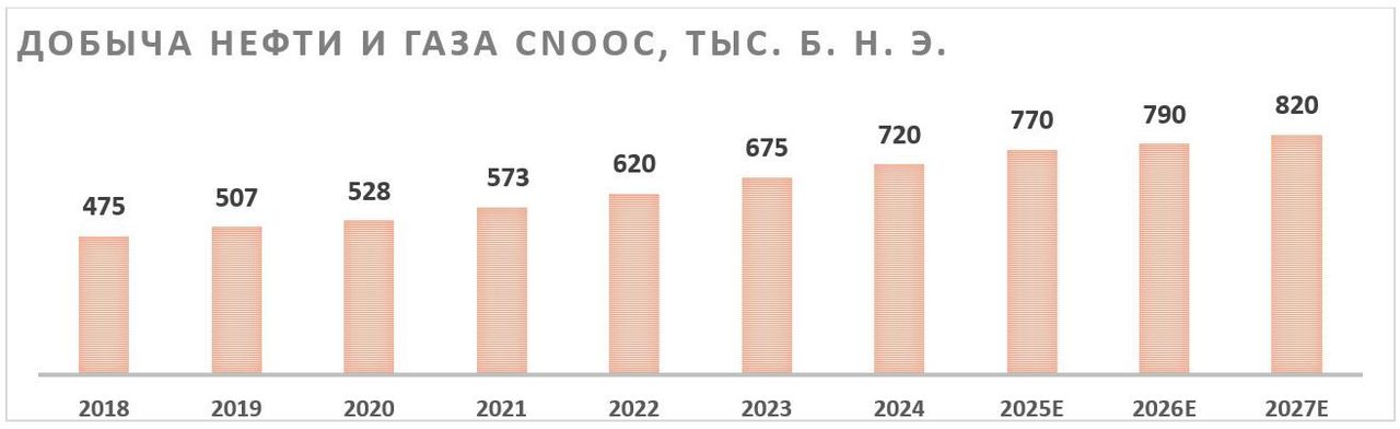 Ключевым положительным моментом в инвестиционной истории China Oilfield Services являются планы CNOOC по росту добычи. К 2027 году CNOOC планирует увеличить добычу углеводородов до 810–830 тыс. б. н. э. в сутки, т. е. на 13–15% относительно уровня 2024 года.