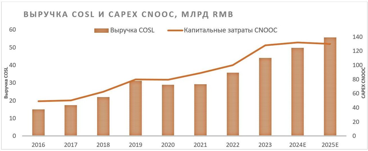 На фоне амбициозных планов по росту добычи CNOOC в ближайшие годы планирует сохранить объем капитальных затрат на повышенном уровне в RMB 125–135 млрд. Так как CNOOC является ключевым клиентом China Oilfield Services, выручка нефтесервисной компании напрямую коррелирует с объемом капитальных затрат CNOOC.