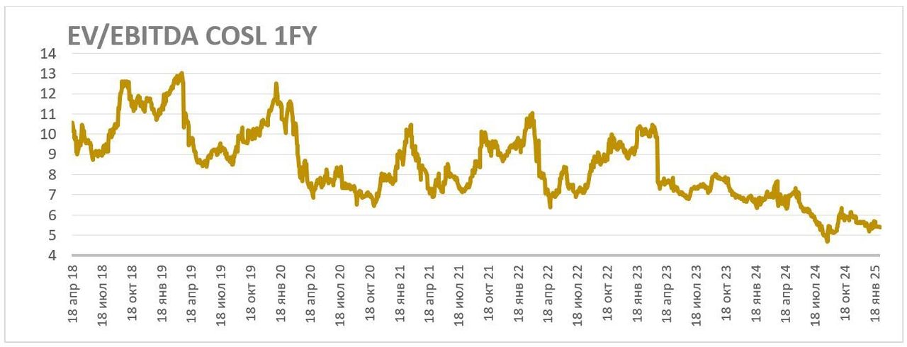 Также нужно обратить внимание, что оценка COSL по форвардному мультипликатору EV/EBITDA опустилась до многолетних минимумов и держится чуть выше 5, несмотря на перспективы компании по увеличению EBITDA и снижению долговой нагрузки в 2024–2026 годах. На наш взгляд, такая оценка является заниженной даже с учетом замедлившихся темпов роста выручки.