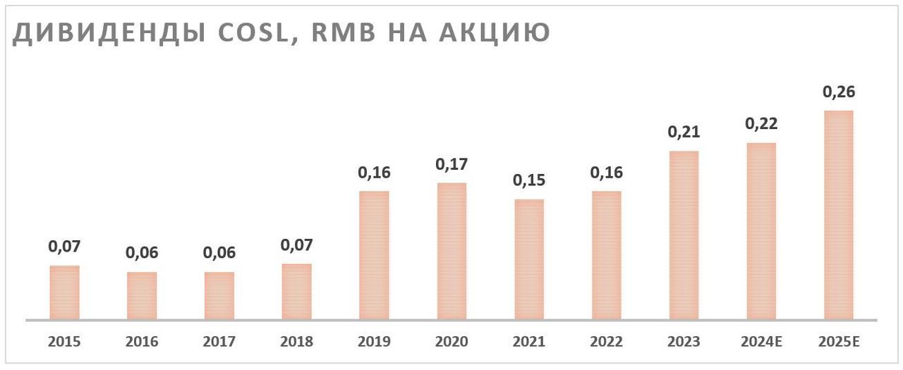 China Oilfield Services стабильно выплачивает неплохие по меркам сектора дивиденды. Исторически норма выплат составляет около 30%. Полагаем, что в будущем такая норма выплат может сохраниться, а размер дивидендов по итогам 2024 года может составить RMB 0,22 (HKD 0,236) на акцию, что соответствует 3,4% доходности.