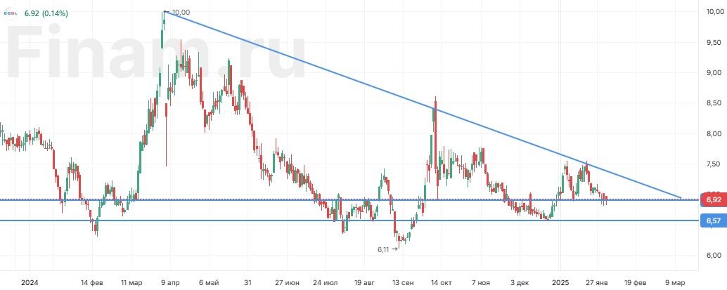 С технической точки зрения на дневном графике акции China Oilfield Services класса H торгуются в рамках среднесрочного нисходящего тренда и локально пытаются удержаться выше поддержки у отметки HKD 6,90. В случае неудачи коррекция может продолжиться до уровня HKD 6,57. В то же время в случае отскока ближайшим сопротивлением выступит граница нисходящего тренда.