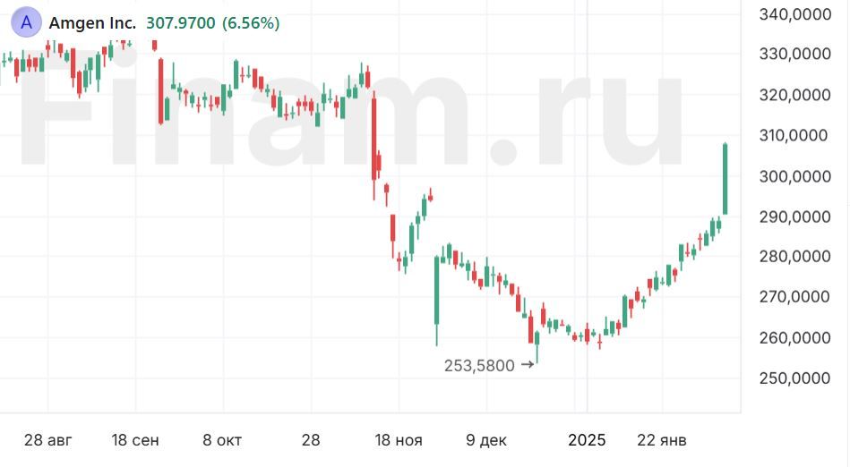 Amgen представила прогнозы на 2025 год: компания ожидает, что выручка составит $34,3–35,7 млрд. Чистая прибыль на акцию по GAAP прогнозируется в диапазоне $10,89–12,14, а скорректированная чистая прибыль на акцию — $20,00–21,20.