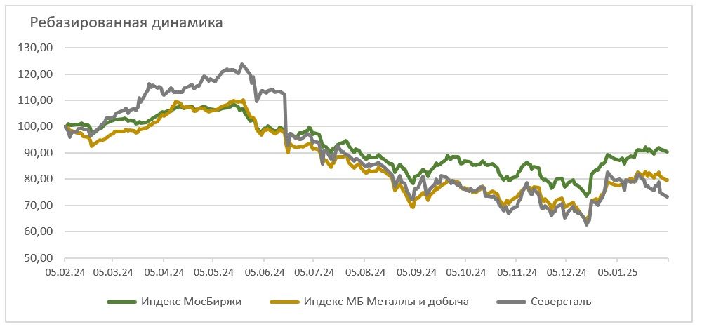 Динамика акций «Северстали» отстает от рынка. За полный календарный год котировки акций «Северстали» подешевели на 25,8%. За это время отраслевой индекс «Металлы и добыча» потерял 19,7%, а индекс МосБиржи опустился на 9,2% (по состоянию на закрытие рынка 05.02.2025).