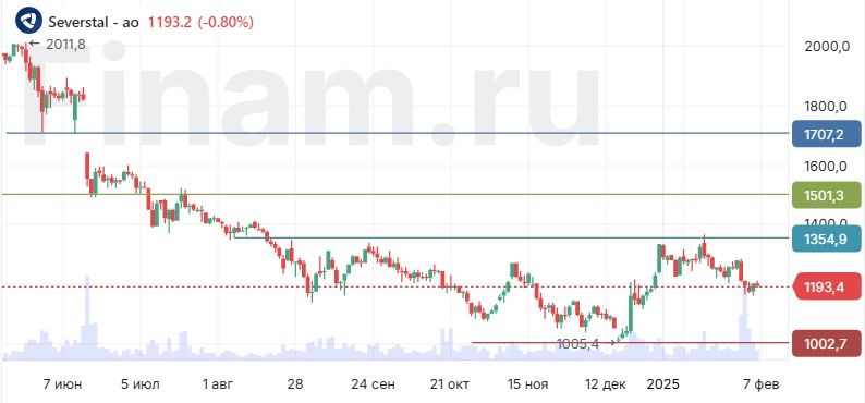 На дневном графике котировки «Северстали» демонстрируют признаки разворота вверх после завершения нисходящего тренда и коррекцию после первой волны роста. Более отдаленной целью может стать закрытие дивидендного гэпа, который образовался в июне 2024 г. в пространстве между 1 640 руб. и 1 710 руб. за акцию. На пути к нему промежуточной целью может стать уровень 1 500 руб. Ближайшее сопротивление проходит около 1 350 руб. Поддержка расположена в районе 1 000 руб.