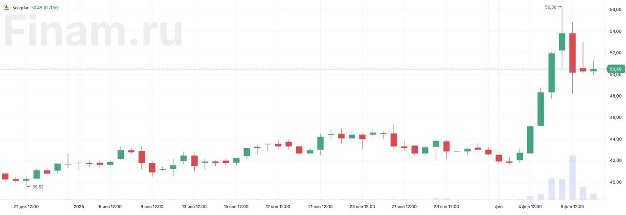 Однако в последние дни акции «Селигдара» неожиданно «раскачались»: еще 3 февраля они стоили около 42 рублей, к 6 февраля подскочили до 56,3, а затем скорректировались в район 50-51. Коррекция последовала после заявления компании о том, что она обеспокоена увеличением волатильности своих акций и даже рассматривает возможность привлечения маркет-мейкера для снижения волатильности котировок.