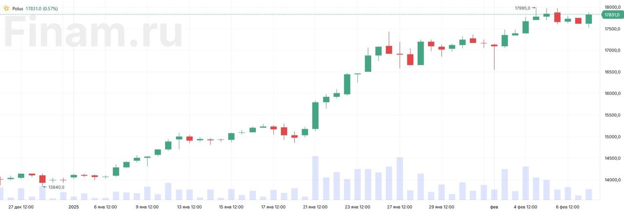 Акции «Полюса» на этом фоне показали опережающий рост: начав год в районе 14000 рублей, они максимально поднимались до 17995 в начале февраля, а затем слегка охладились – в район 17800.