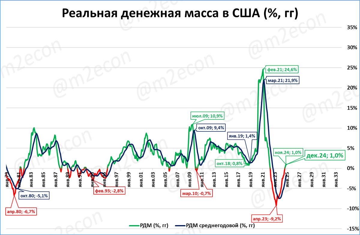 Именно поэтому, несмотря на падение РДМ в 2021-23 годах, ВВП США не падал. По итогам 2024 года он вырос на 2,8%.