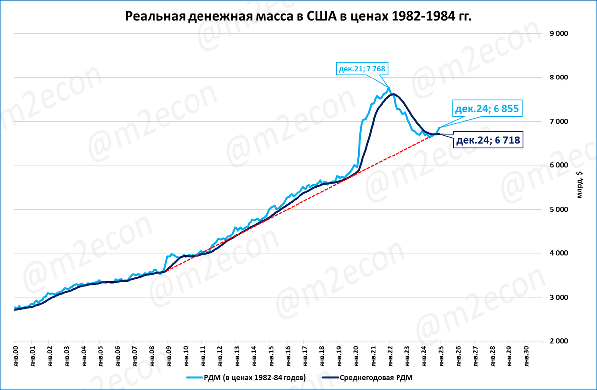 Падение РДМ с декабря 2021 года было масштабным. Даже сейчас показатель ниже, чем тогда. Но это было падение после небывалого (с 1940-х годов) роста. И стало всего лишь возвращением к линии многолетнего тренда (красный пунктир на графике выше).