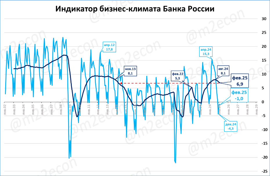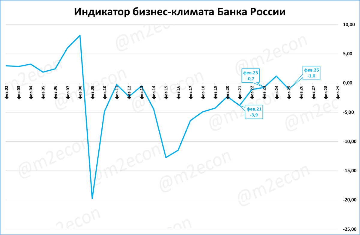 По индикатору бизнес-климата нынешний февраль (-1,0 пункта) ниже, чем февраль 2023 (+1,18), и чем февраль 2023 (-0,7).