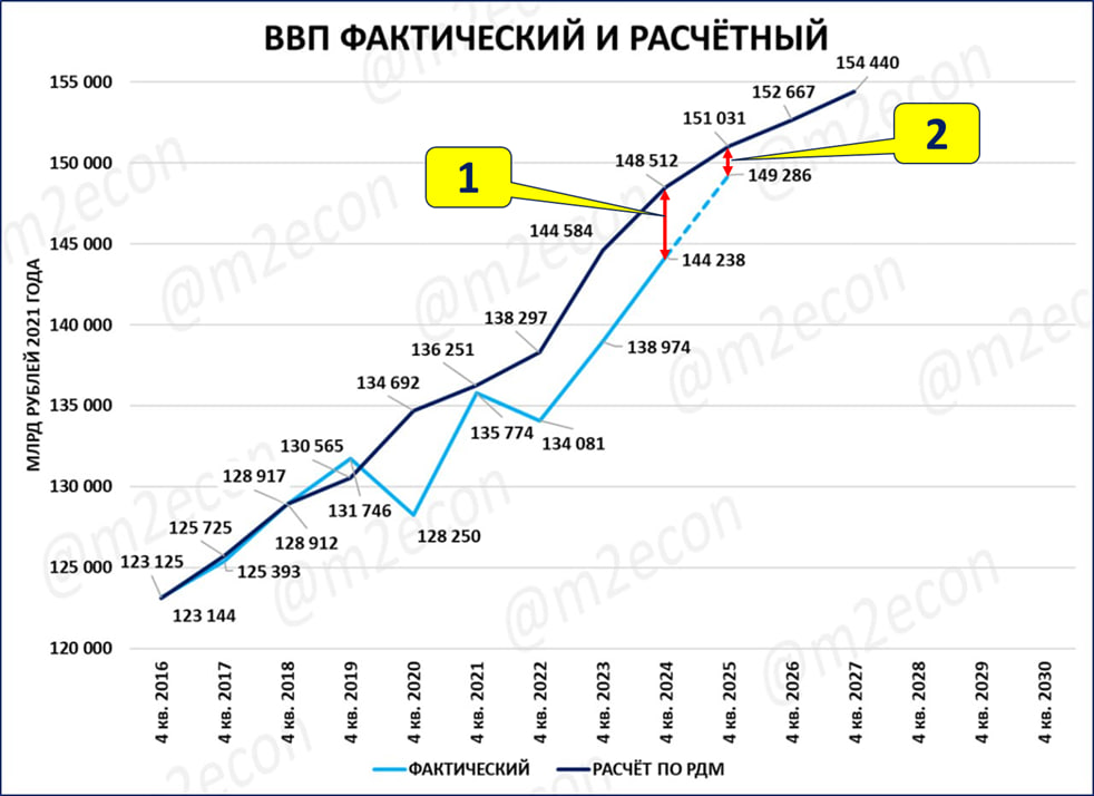 Экономика ещё не полностью использовала тот потенциал, который был задан ростом реальной денежной массы, прежде всего в 2023 году. Этот неиспользованный потенциал на начало 2025 года остаётся большим (выноска 1 и красная стрелка).