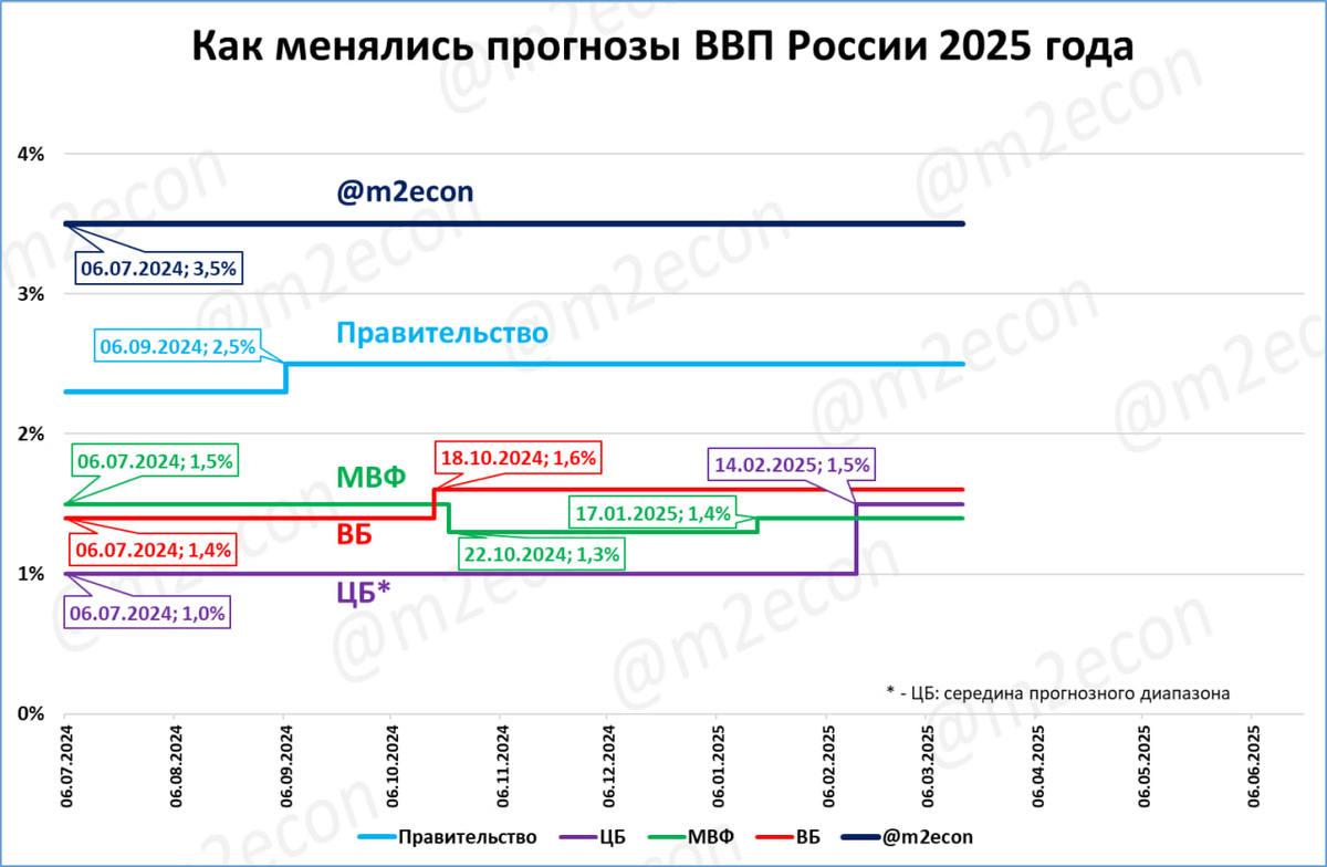 Новый прогноз Банка России (1,5%) оказался аккурат между прогнозами МВФ (1,4%) и Всемирного банка (1,6%).