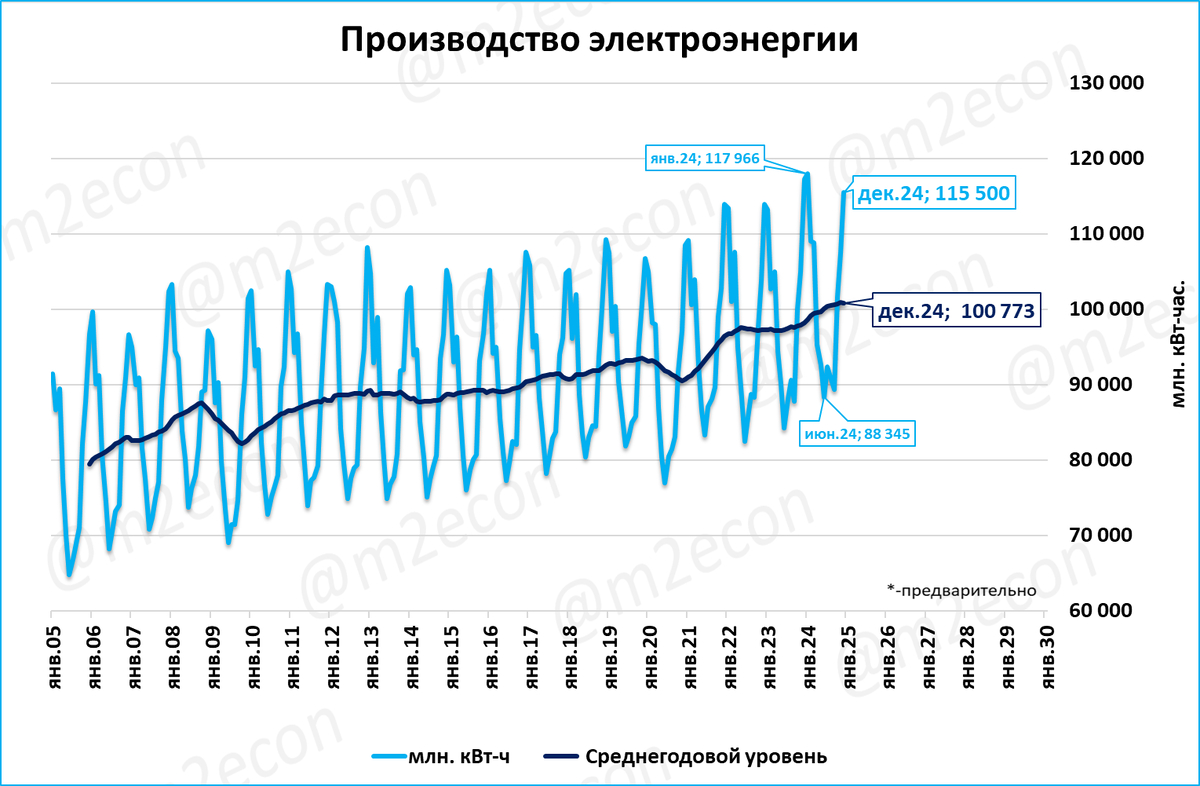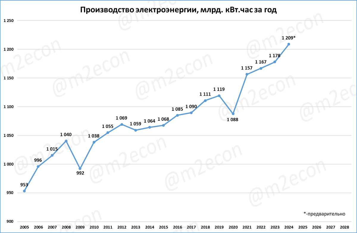 В 2024 году производство электроэнергии в России стало рекордным за всю историю: 1 209 млрд. кВт-часов за 12 месяцев.
