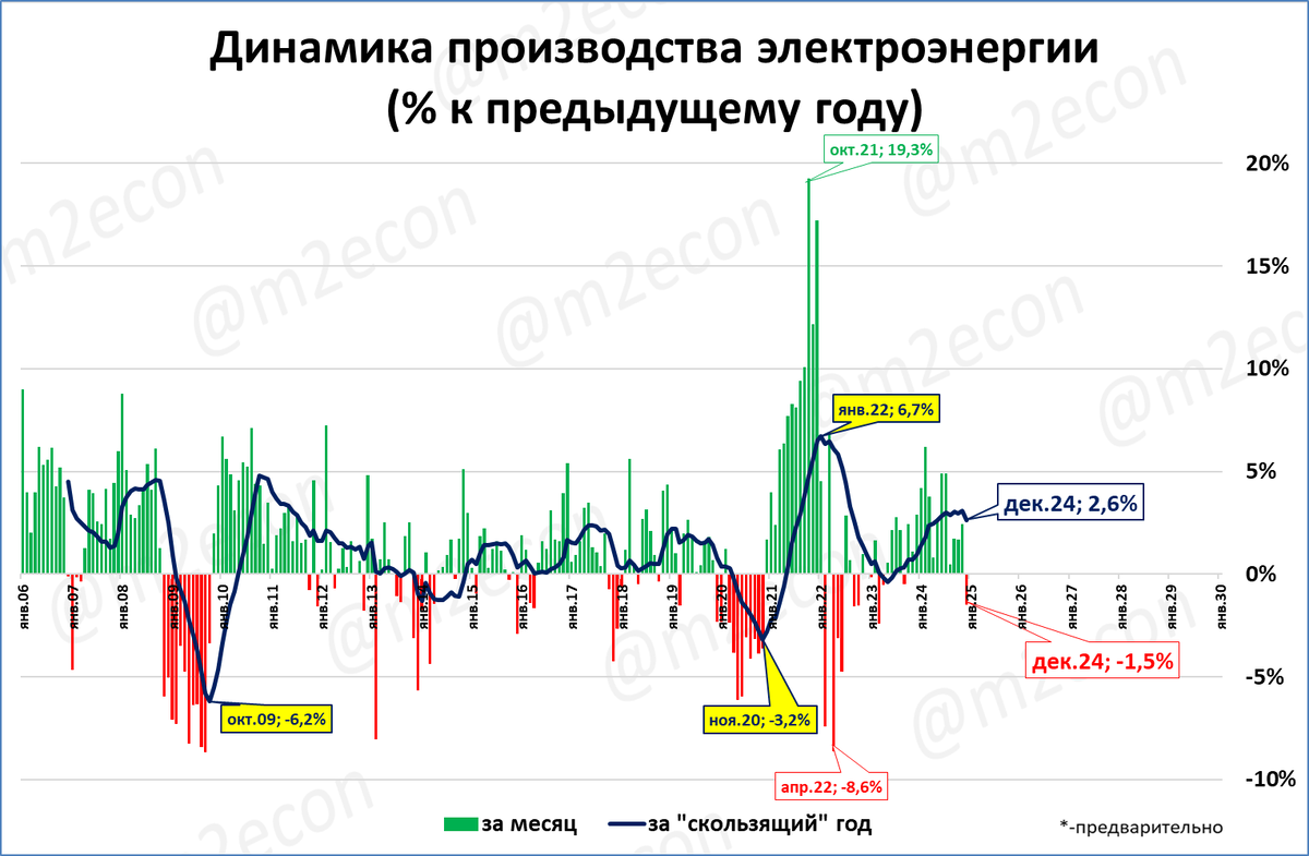В 2024 году в России было произведено рекордное количество электроэнергии. Объём производства впервые в истории превысил 1,2 трлн киловатт-часов. Есть и тревожные нотки: в декабре производство электроэнергии упало на 1,5% к декабрю 2023 года. Это первое падение после 14 месяцев роста подряд, но оно может объясняться температурным фактором.