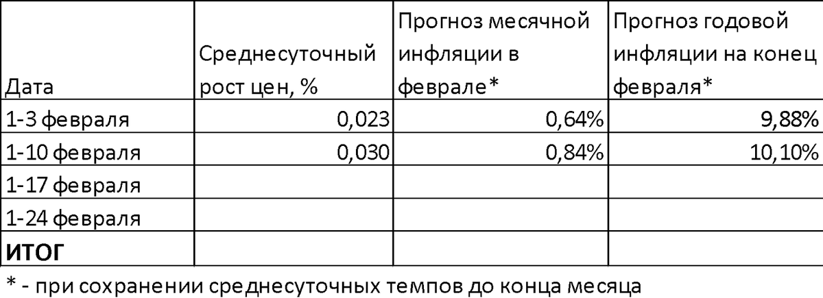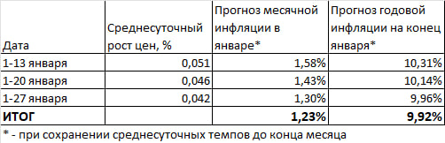 Среднесуточный рост цен 0,023% (см. первую строку таблицы) означал бы, что рост инфляции остановился;
