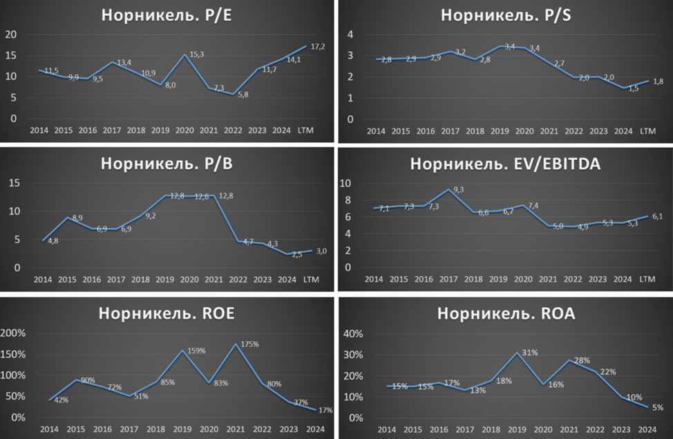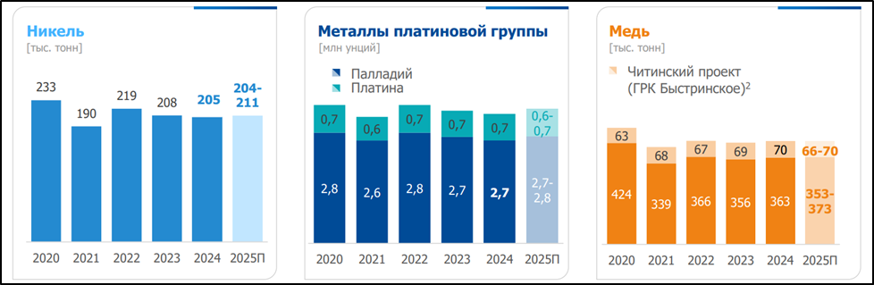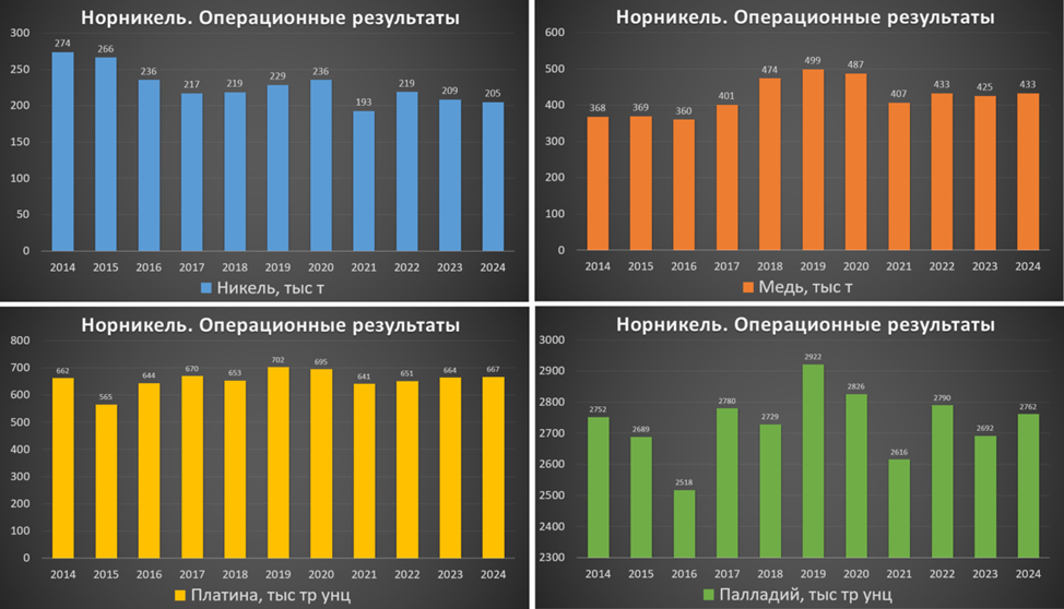 Объемы производства зависели от ремонтов. И в итоге изменились несильно, но превысили прогнозы компании. Вообще производство никеля на треть ниже, чем 10 лет назад. А долгосрочная динамика по остальным металлам слегка положительная.