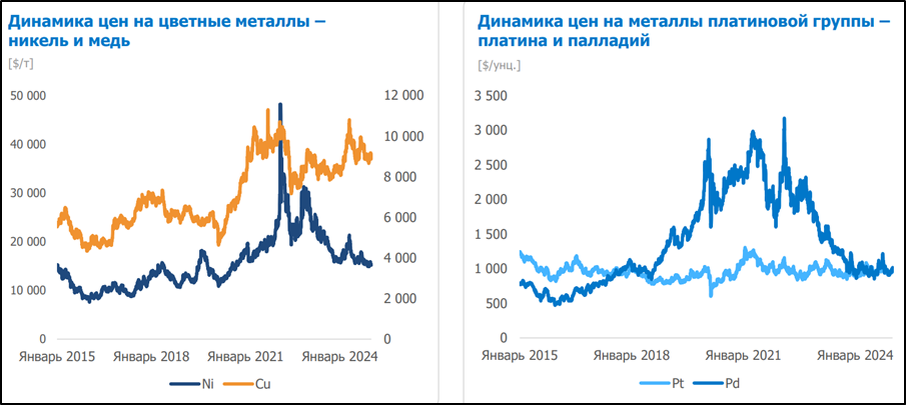 Динамика средние цен на основные металлы Норникеля в 2024 году: