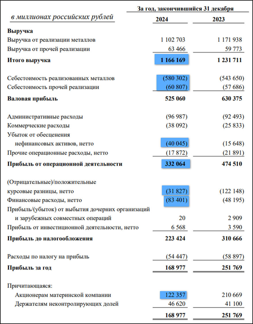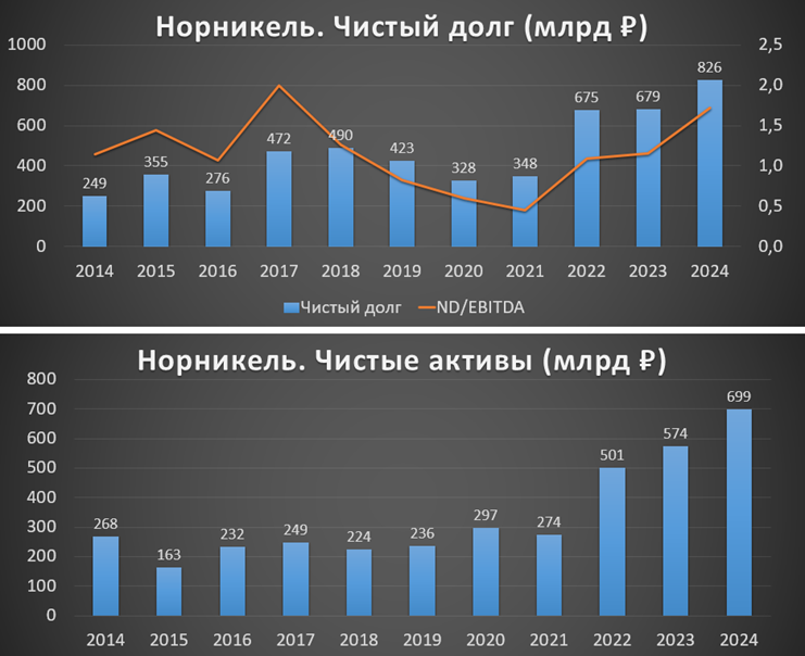 Выручка слегка уменьшилась из-за падения цен на никель и палладий и снижения объемов продаж. Поддержку оказала девальвация рубля. Расходы выросли меньше инфляции. Причём основной рост пришёлся на новые экспортные таможенные пошлины, которые действовали до конца 2024 года.