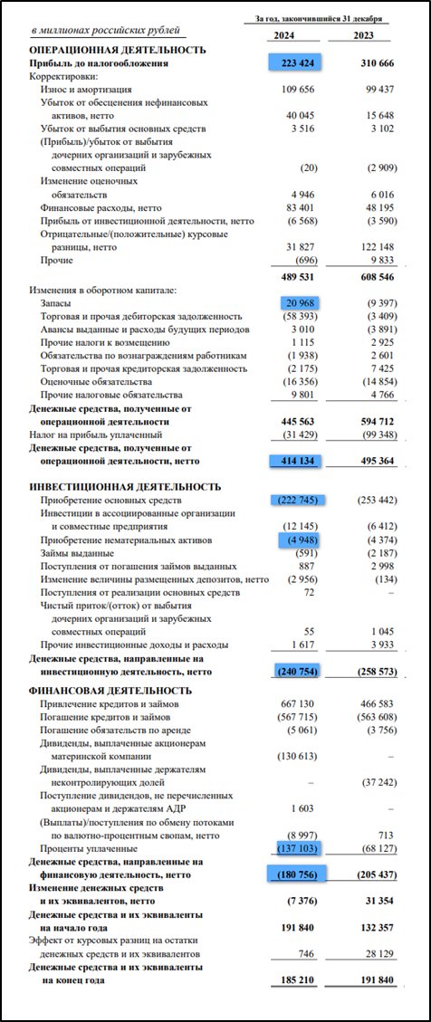 операционная деятельность 414 млрд (-16% г/г). В основном это результат роста дебиторской задолженности, который отражает трудности покупателей в проведении трансграничных платежей.
