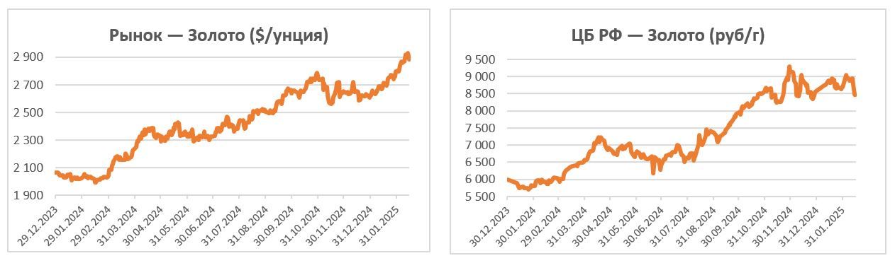 В РФ рублевые цены на золото, устанавливаемые ЦБ, с начала 2024 года также выросли на 41,2% (по состоянию на 15 февраля 2025 года). На начало 2025 года рост был больше, но он был компенсирован недавним укреплением российского рубля.