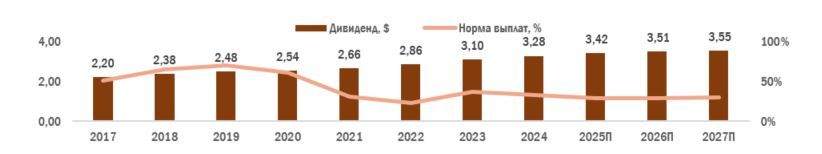 Стабильная дивидендная история. По нашим расчетам, в ближайшие 12 месяцев компания может выплатить акционерам дивиденд в размере $3,42 на акцию, что соответствует довольно высокой для технологического сектора США дивидендной доходности в 2,0%.