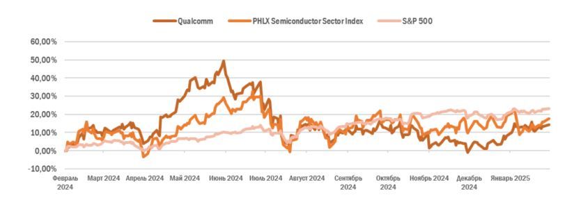 За последние 12 месяцев акции Qualcomm продемонстрировали более слабую динамику по сравнению с широким рынком и полупроводниковой отраслью США. Котировки компании выросли на 14,3%, в то время как отраслевой индекс PHLX Semiconductor увеличился на 17,8%, а S&P 500 — на 23,2%. Акции Qualcomm менее зависят от роста спроса на вычислительные мощности, которые необходимы для развития ИИ-технологий, поэтому, например, они слабо отреагировали на «шок DeepSeek» в январе 2025 года.