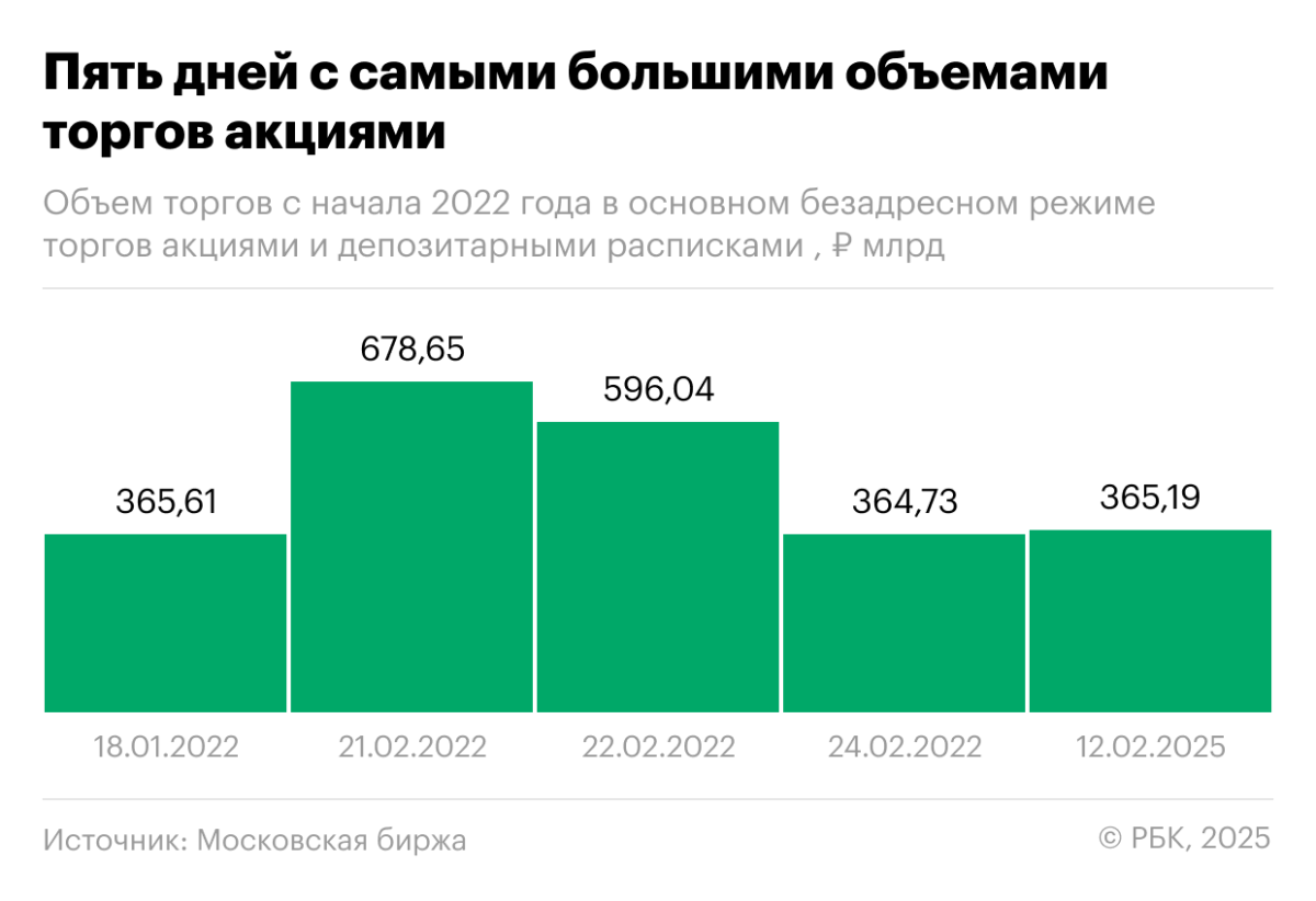 По сообщению Мосбиржи, суммарный объем торгов на рынке акций Мосбиржи 12 февраля 2025 года достиг максимума с марта 2022 года — ₽422,5 млрд, а на вечерней сессии 12 февраля и утренней сессии 13 февраля были установлены рекорды за всю историю — ₽237 млрд и ₽85 млрд соответственно.