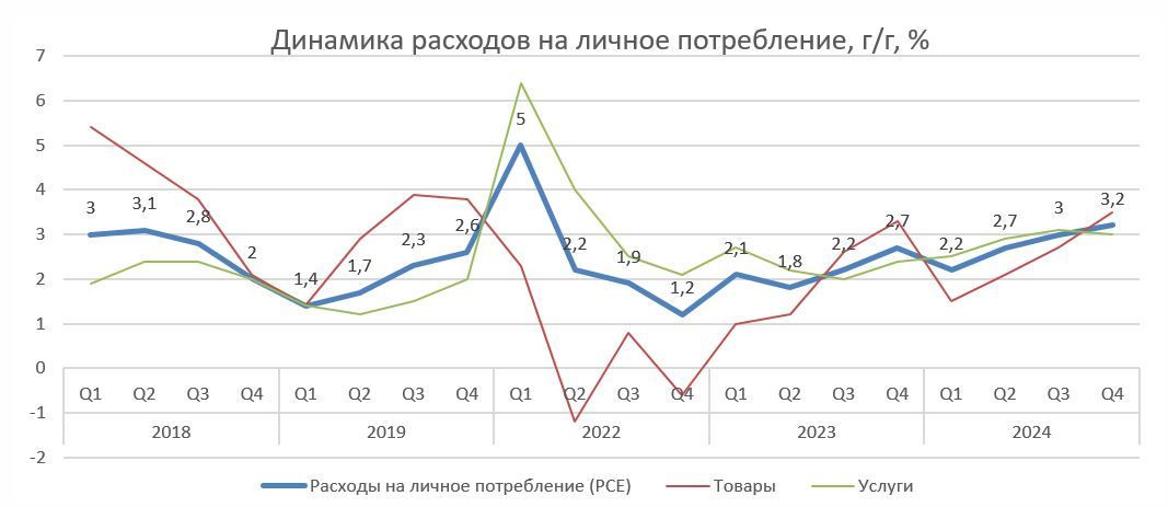 В IV квартале 2024 года активность потребителей в США, судя по макроданным, продолжила расти, однако все еще оставалась в некоторой степени подавленной, и темпы роста замедлились. В IV квартале индекс расходов на личное потребление и розничные продажи увеличились, однако индексы доверия потребителей от университета Мичигана и Conference Board (CB) снизились на фоне высокой неопределенности, связанной с внешнеторговой политикой Дональда Трампа.