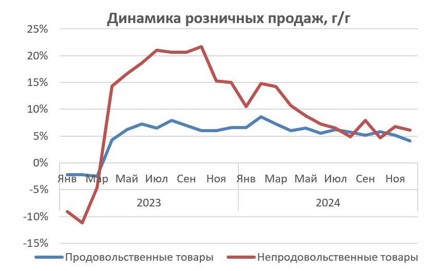 Ожидания по потребительскому сектору на 2025 год остаются умеренными, экономисты ждут небольшого ускорения роста розницы и инфляции, однако значительного улучшения потребительских настроений ждать не стоит.
