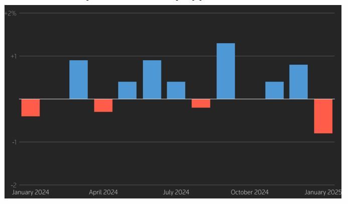 Розничные продажи в США упали на 0,9% (м/м) в январе, что стало самым резким падением почти за два года, в основном из-за суровой зимней погоды и лесных пожаров. Несмотря на падение, экономисты считают, что это не сигнал о фундаментальном изменении потребительских расходов, поскольку продажи в декабре были пересмотрены в сторону повышения, а расходы по-прежнему поддерживаются устойчивым рынком труда и высоким благосостоянием домохозяйств. Однако потребительские настроения ослабли, а инфляционные ожидания выросли до 15-месячного максимума.