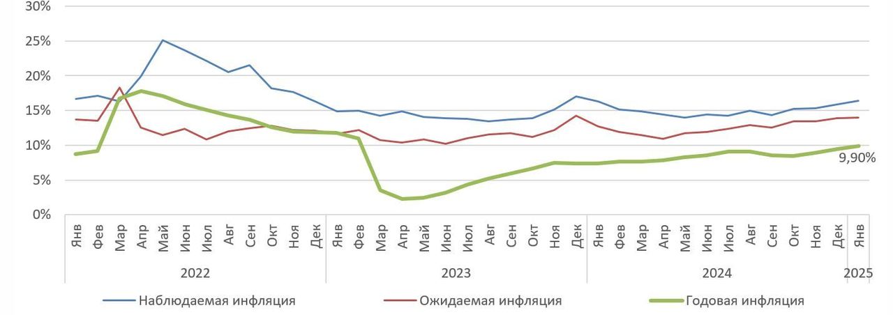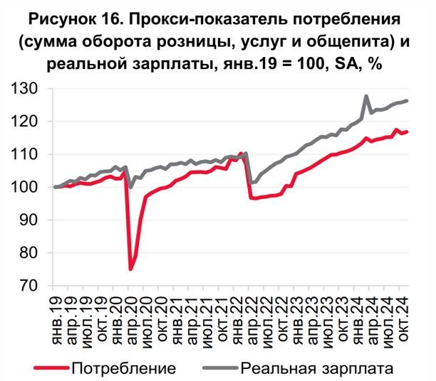 В январе 2025 года инфляция ускорилась до 9,92% (г/г). Продовольственные товары в январе подорожали на 1,33% (в годовом выражении — на 11,13%). Непродовольственные товары в январе стали дороже на 0,42% (в годовом выражении — на 6,07%). Услуги в январе подорожали в среднем на 2,07% (в годовом выражении — на 12,95%). Существенный рост зарплат пока компенсирует сильное удорожание большинства товаров. Наблюдаемая населением инфляция в январе продолжила повышаться. Ее значение было равно 16,4% (+0,5 п.п. (м/м); +0,1 п.п. (г/г)). Медианная оценка инфляционных ожиданий на годовом горизонте практически не изменилась, сохраняясь на максимуме с декабря 2023 года — 14,0%. Высокие ожидания по инфляции являются дополнительным стимулом к потреблению (при сопоставимом росте доходов), особенно дискреционных товаров.