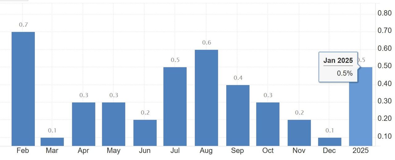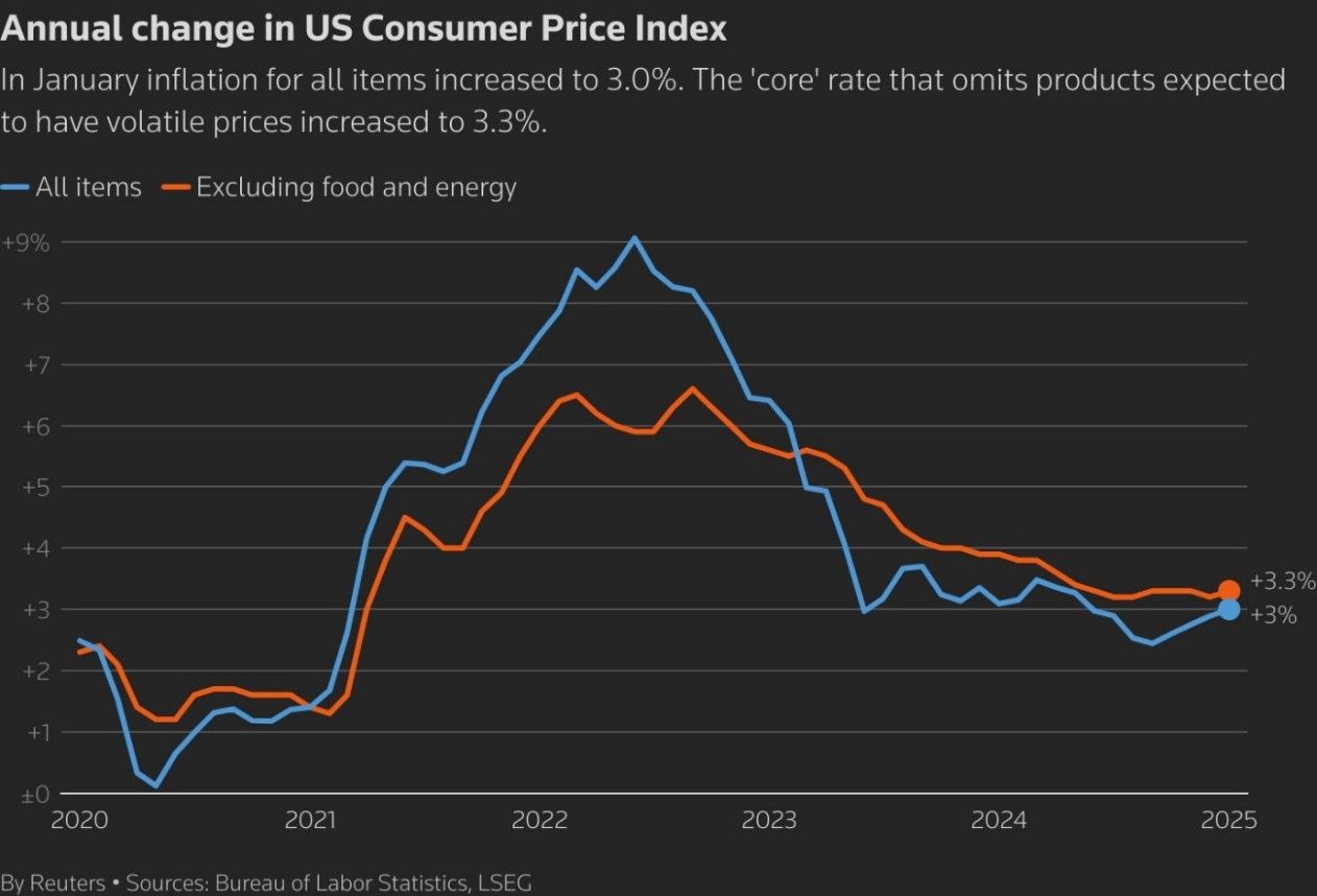 Потребительские цены в США резко выросли в январе, что стало самым большим ежемесячным ростом почти за 18 месяцев. Индекс потребительских цен (ИПЦ) вырос на 0,5% (м/м) в январе, превзойдя ожидания, а годовая инфляция достигла 3,0%, самого высокого уровня с июня 2024 года. Базовая инфляция, которая не включает продукты питания и энергоносители, выросла на 3,3% в годовом исчислении, что указывает на сохраняющееся ценовое давление.