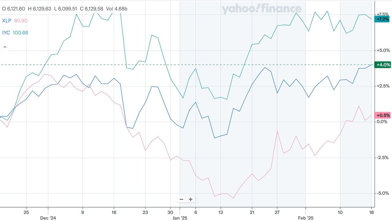Рынок в целом и большинство акций потребительского сектора в частности остаются дорогими. Однако в акциях компаний, удовлетворяющих базовые потребности, остается небольшой потенциал. Широкий рынок (синий график) за последние 3 месяца (с 19.11.2024) прибавил 4,0%, в то время как XLP (розовый график) вырос всего 0,5%, а IYC (бирюзовый график) — на 7,5%. Если смотреть более глобально (за 12 прошедших месяцев), то IYC опережает рост S&P 500, в то время как XLP топчется на месте.
