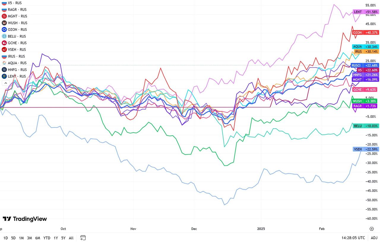 Отметим, что на фоне общерыночной эйфории большинство бумаг потребительского сектора в последние 2 месяца продемонстрировали рост на десятки процентов, поэтому их дальнейший потенциал выглядит ограниченным. Например, с 19 декабря (20 декабря ЦБ сохранил ключевую ставку на уровне 21%, что привело к развороту на рынке) по 20 февраля бумаги Ozon взлетели на 57%, Whoosh — на 49%, «ВИ.ру» — на 48%.