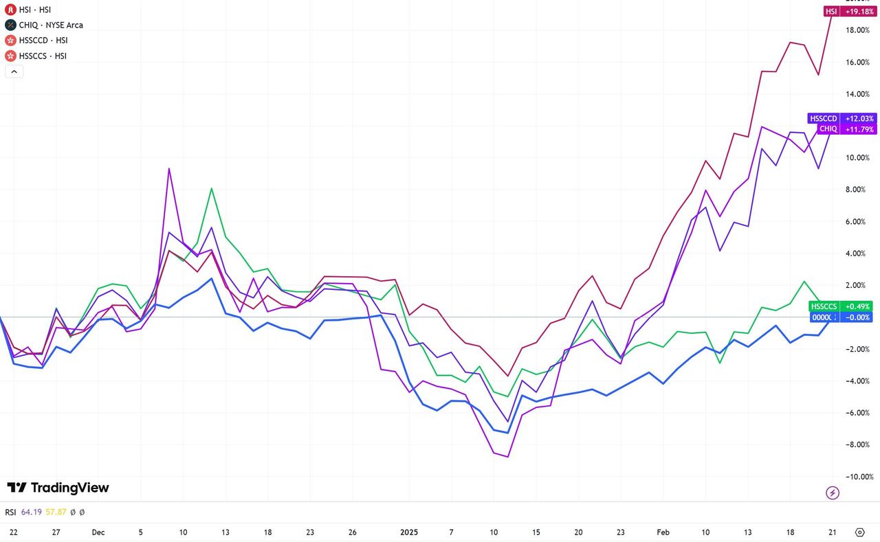 Акции материкового Китая (индекс CSI 300) последние 3 месяца топчутся на месте. При этом индекс гонконгской биржи (HSI) увеличился на 19,2%, индекс потребительских компаний первичного спроса, торгующихся на гонконгской бирже, (HS COMP STAPLES, HSSCСS) подрос на 0,5%, а индекс компаний вторичного спроса (HS CONSUMER DISC, HSSCCD) прибавил 12,0%. Причиной такого расхождения акций базового и дискреционного спроса стал китайский ИИ-стартап DeepSeek. Акции (в том числе потребительского сектора), как-то связанные с технологиями или ИИ росли лучше после релиза DeepSeek и заявлений крупных компаний (Alibaba, Baidu, Xiaomi и др.) о внедрении чат-бота в их продукты. Акции Alibaba за месяц взлетели на 66%, Xiaomi — на 43%, бумаги Baidu прибавили 9%.