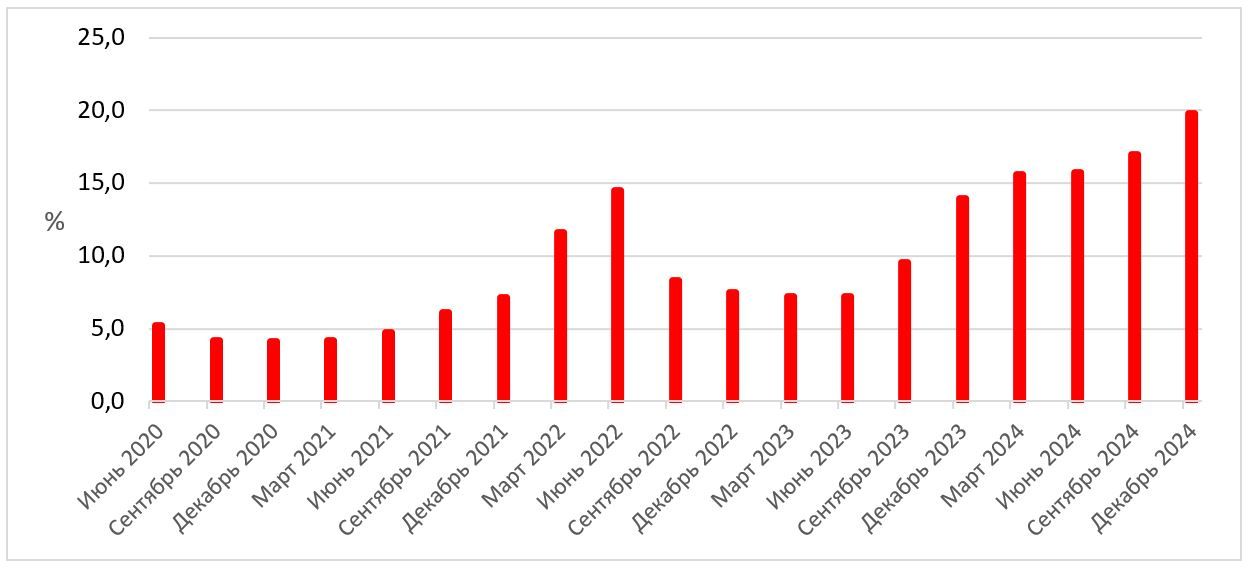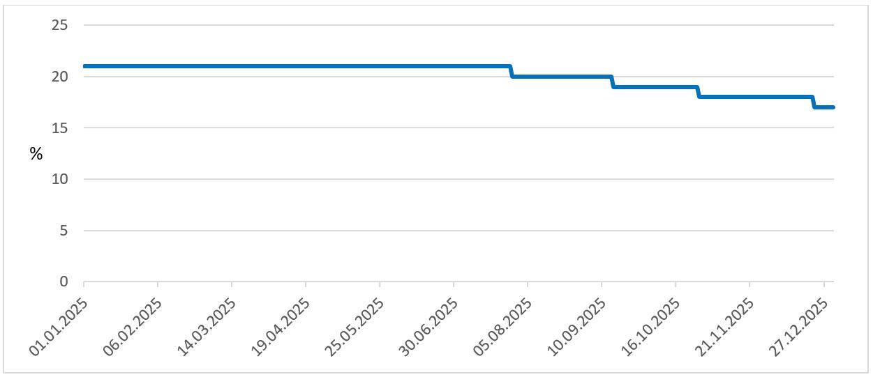 По нашему базовому прогнозу, средний уровень ключевой ставки в 2025 году составит 20,0%. Кроме того, для оценки денежного потока необходимо учитывать, что ставка купона по флоатерам рассчитывается с определенным лагом. Получение ставки как бы из «прошлого», естественно, благоприятно в те периоды, когда она переходит к снижению.