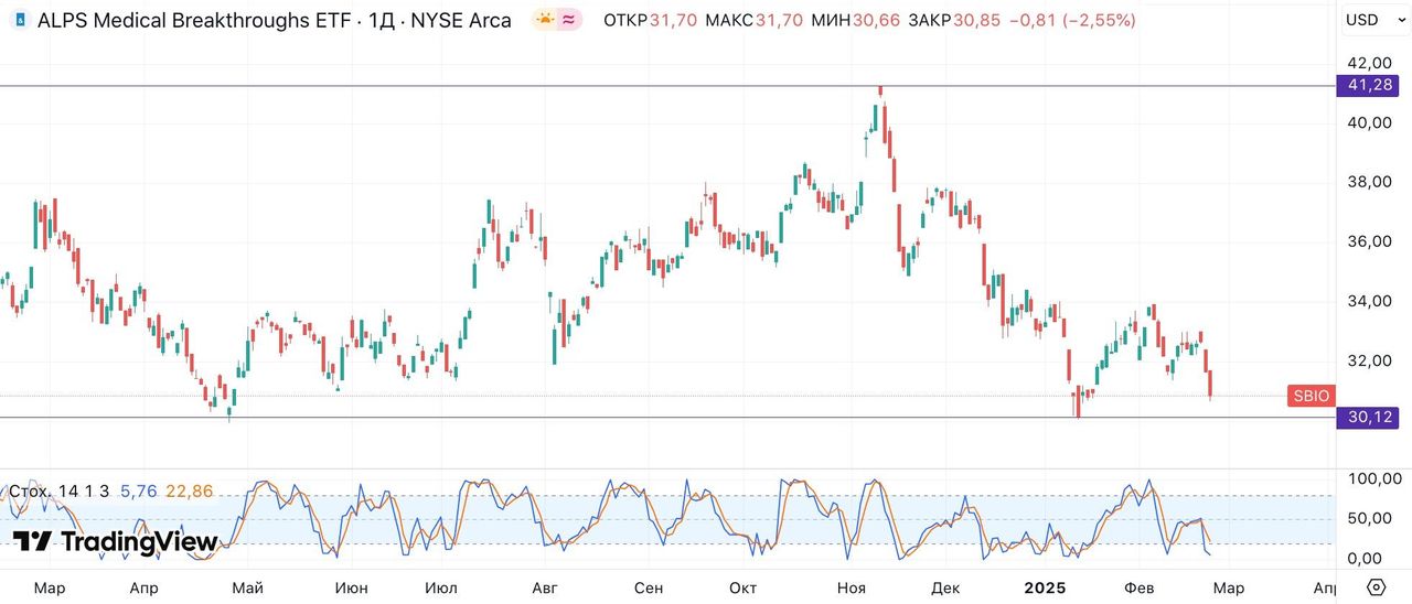 Индексный фонд ALPS Medical Breakthroughs ETF с привязкой к прорывам биотеха после президентских выборов в США оказался под заметным давлением — инвесторы испытывают временное беспокойство касательно судьбы фармы и биотеха при новой администрации, не отличающейся предсказуемостью, однако, на наш взгляд, масштаб беспокойства значительно преувеличен. Отрасль «обречена» на непрерывное развитие, с каждым годом FDA одобряет все больше новых препаратов, биотех находится на передовой инновационных разработок. Вместе с тем стоит иметь в виду, что вложения в компании с прорывными разработками и нулевой выручкой не относятся к классическим активам сектора здравоохранения и не имеют «защитных» свойств, напротив, это высокорисковые вложения.
