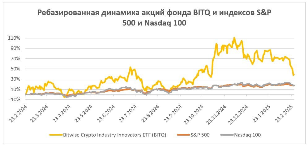 На протяжении последних 12 месяцев фонд существенно обгоняет по динамике основные американские индексы (если за год фонд вырос на 39% с учетом коррекции с начала декабря, то S&P 500 и Nasdaq 100 лишь на 17% и 18%, соответственно). Несмотря на столь выдающуюся динамику, не стоит забывать, что крипторынок очень цикличен и волатилен.