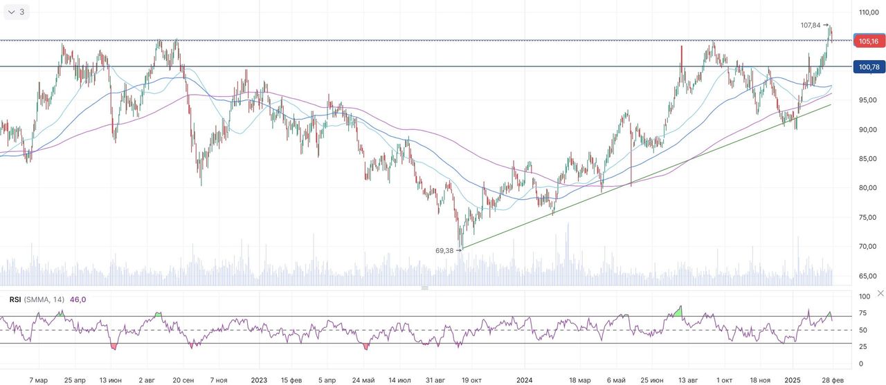 В том числе оценка целевой цены акций аналитиками Guggenheim Securities составляет $109 («Держать»), Wells Fargo Securities — $107 («Держать»), Evercore ISI — $102 («Держать»).