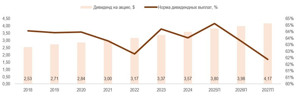 Регулярное увеличение дивидендов. В октябре 2024 года AEP увеличила размер ежеквартальной выплаты акционерам на 5,7%, до $0,93 на акцию. По нашим оценкам, дивиденды в следующие 12 месяцев могут составить $3,80 на акцию, что соответствует неплохой дивидендной доходности 3,6%. Мы ожидаем, что AEP в ближайшие годы продолжит увеличивать размер выплат на 5–6% в год по мере роста чистой прибыли.