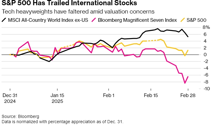 Индекс S&P 500 вырос всего на 1% в этом году, в то время как индекс MSCI All-Country World Index без учёта США вырос на 5%.