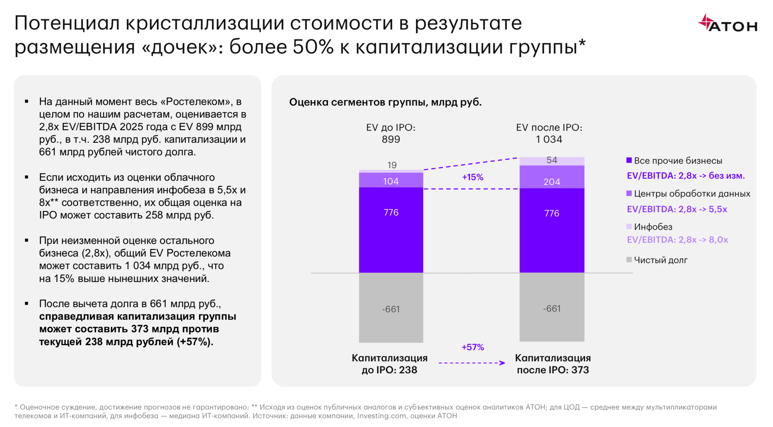 капитализации и 661 млрд рублей чистого долга. Если исходить из оценки облачного бизнеса и направления информационной безопасности в 5,5x (среднее между оценкой телекомов и ИТ) и 8x (медиана по ИТ) соответственно, их суммарная оценка на IPO может составить 258 млрд рублей. При неизменной оценке остального бизнеса (2,8x) общий EV «Ростелекома» может составить 1 034 млрд рублей, что на 15% выше текущих значений. После вычета долга (661 млрд рублей) оценочная капитализация группы может составить 373 млрд рублей, что на 57% выше текущего значения (238 млрд рублей).
