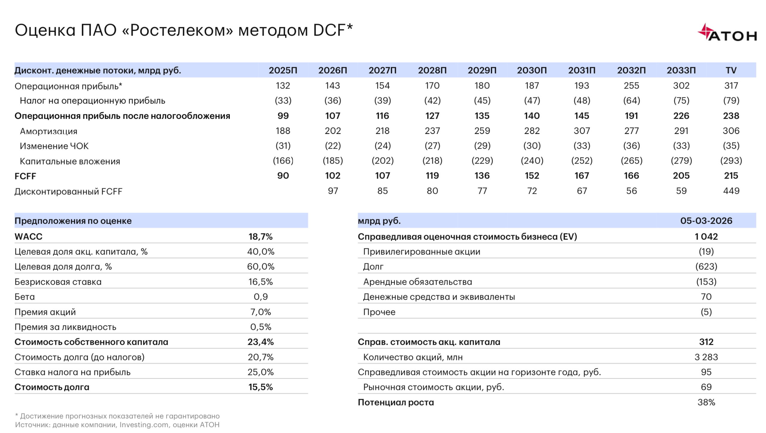 На данный момент «Ростелеком» в целом, по нашим расчетам, оценивается в 2,8x EV/EBITDA 2025 года с EV 899 млрд рублей, в т. ч. 238 млрд рублей