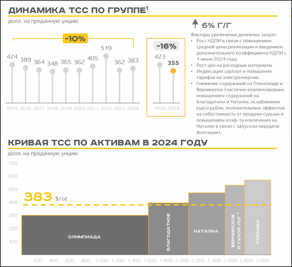 Общие денежные затраты выросли на 6% до 383$ на унцию. Основные причины: рост НДПИ, инфляция, увеличение зарплат и снижение содержаний на Олимпиаде. Самые низкозатратные месторождения: Олимпиада и Благодатное.