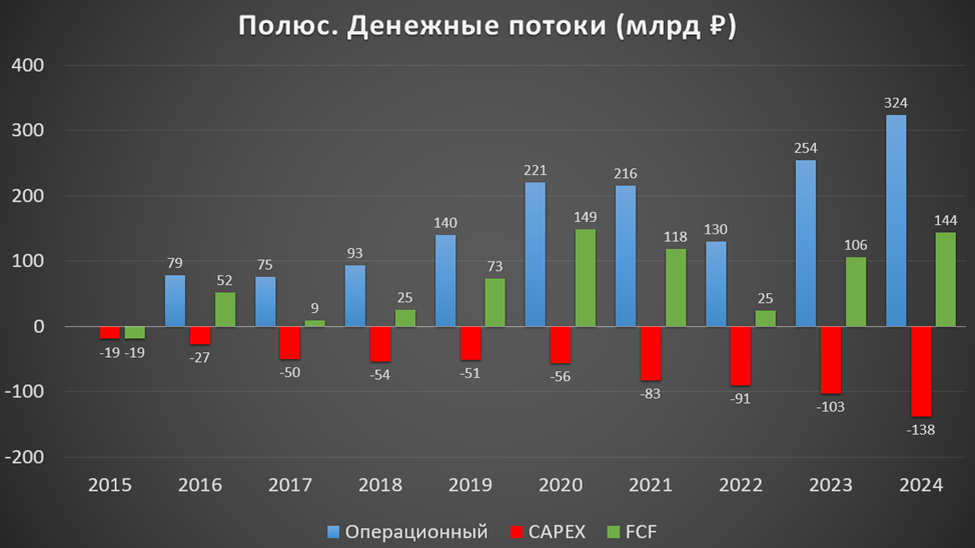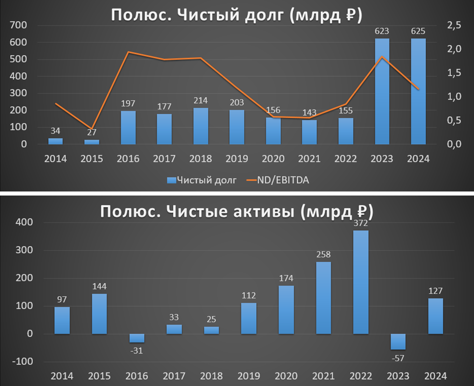 Также еще раз отмечу, что в 2023 году компания провела обратный выкуп 30% своих акций на общую сумму 580 млрд. Причём программа выкупа имела сомнительных характер, т.к. Полюс выкупил акции не у всех желающих, а у конкретного крупного акционера и выплатил за них на треть больше их рыночной цены. Именно из-за этого резко вырос долг, и компания приостановила выплату дивидендов.