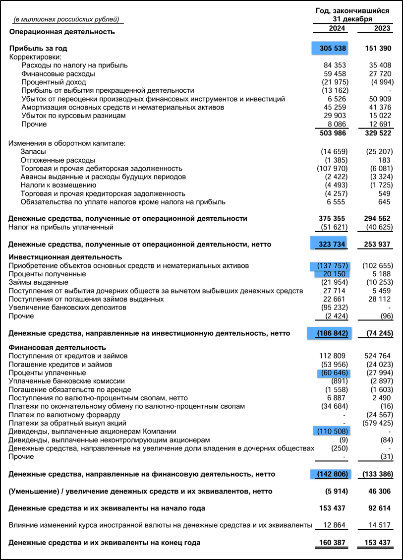 операционная деятельность 324 млрд (+27% г/г). Отражает рост ЧП.