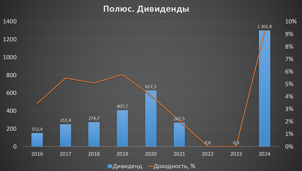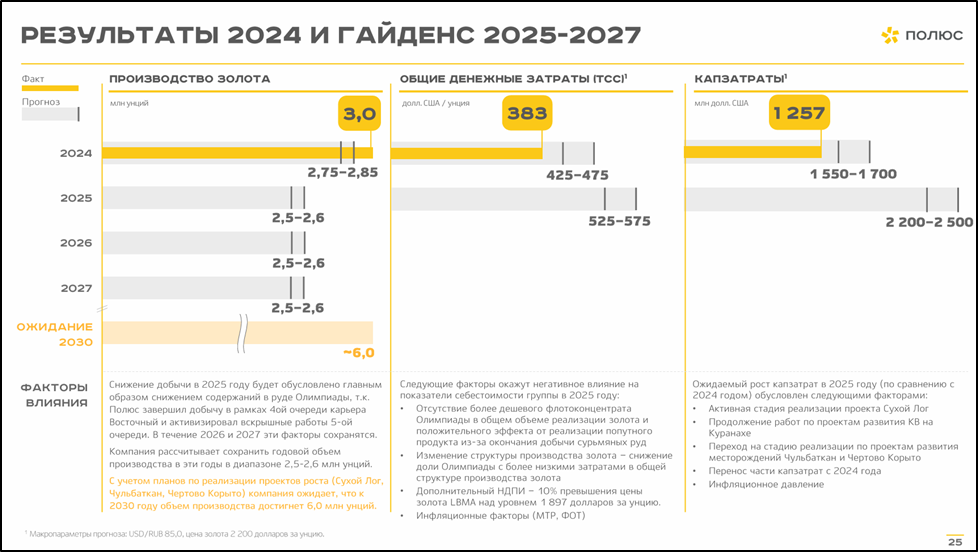 Ещё компания дала прогноз на 2025 год. Кстати, факт по прошлому году оказался лучше прогнозов компании. А в части текущего года Полюс планирует спад производства золота примерно на 15% из-за снижения содержаний в руде Олимпиады. Далее объёмы производства стабилизируются до 2027 года. Общие затраты вырастут до 1,5 раз из-за снижения в общей структуре производства доли Олимпиады, у которой самая низкая себестоимость. Капзатраты могут вырасти до двух раз из-за активной стадии реализации проектов. Таким образом, ожидается, что результаты в 2025 году будут под давлением, поэтому не стоит рассчитывать на высокие дивиденды.