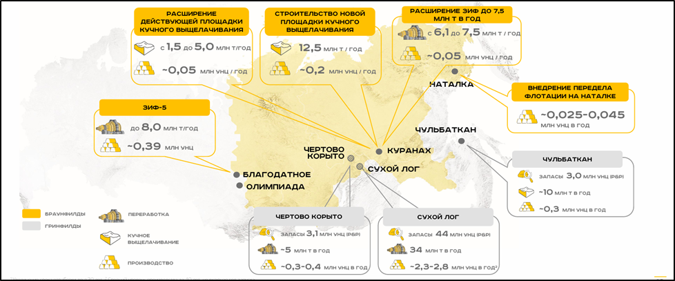 У Полюса сейчас несколько проектов развития: Чертово корыто, Чульбаткан и Сухой лог. Причём Сухой лог – крупнейшее месторождение в мире. И оно в 1,5 раза мощнее Олимпиады. По плану, запуск проекта ожидается с 2028 года.