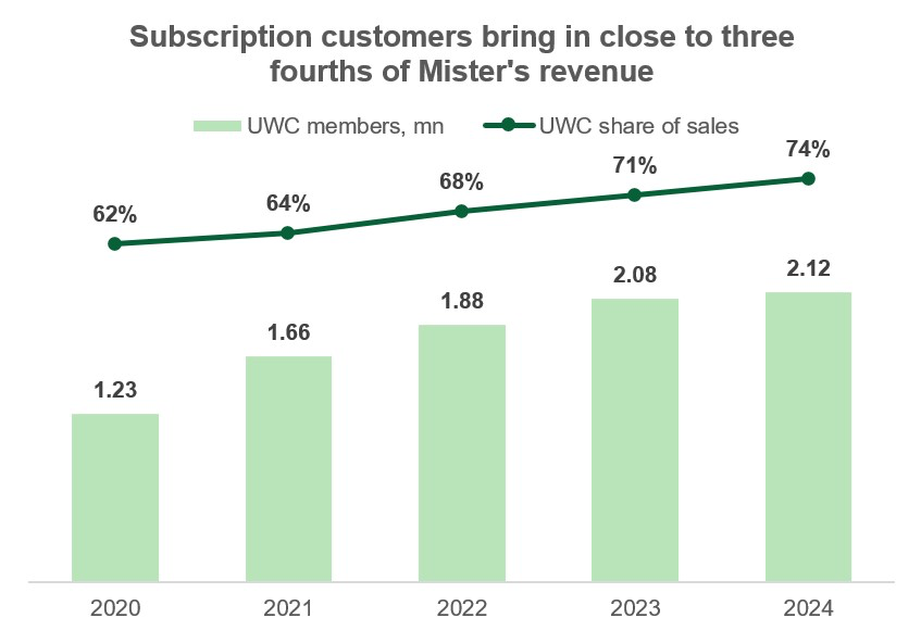 Клиенты благосклонно принимают подписочную модель, и ее доля в продажах стабильно растёт: с 62% в 2020 году до 74% в 2024 году. По данным компании, средний подписчик UCW тратит в четыре раза больше, чем разовый клиент, что способствует росту продаж на фоне увеличения проникновения подписки.